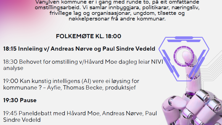 Folkemøte - Omstilling i Vanylven kommune Vanylven kommune er i gang med runde to, på eit omfattande omstillingsarbeid. Vi samlar innbyggjara, politikarar, næringsliv, frivillige lag og organi...